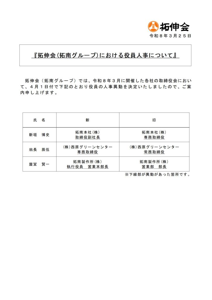 このたび、拓伸会において、役員人事が決定しましたので、ご案内申し上げます。